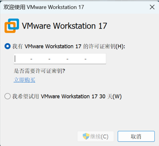 前(qián)面(miàn)说(shuō)了(le)VMware是付费软(ruǎn)件(jiàn),是需要(yào)購買(mǎi)的(de),如(rú)果(guǒ)你購買(mǎi)了(le)VMware的(de)話(huà)就(jiù)会(huì)有(yǒu)一(yī)串許可(kě)密鑰,如(rú)果(guǒ)沒(méi)有(yǒu)購買(mǎi)的(de)話(huà)就(jiù)選擇“我(wǒ)希望試用(yòng) VMware Workstation 15 30天(tiān)”選項,这(zhè)樣(yàng)你就(jiù)可(kě)以(yǐ)體(tǐ)验(yàn)30天(tiān) VMware。輸入(rù)密鑰以(yǐ)后點(diǎn)擊“繼續按鈕”,如(rú)果(guǒ)你的(de)密鑰正(zhèng)确的(de)話(huà)就(jiù)会(huì) 提(tí)示你購買(mǎi)成(chéng)功。