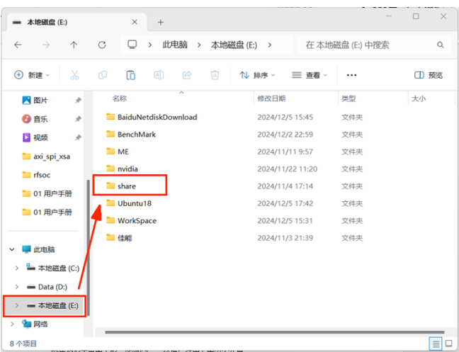 現(xiàn)在(zài)我(wǒ)们(men)需要(yào)添加共(gòng)享的(de)文(wén)件(jiàn)夾了(le)。这(zhè)里(lǐ)我(wǒ)们(men)在(zài)Windows的(de)E盤里(lǐ)新建一(yī)个(gè)名(míng)为(wèi)“share”的(de)文(wén)件(jiàn)夾,如(rú)下(xià)图(tú)所(suǒ)示。这(zhè)个(gè)文(wén)件(jiàn)夾就(jiù)是以(yǐ)后我(wǒ)们(men)用(yòng)来(lái)在(zài)Windows和(hé)Ubuntu系(xì)統之間(jiān)共(gòng)享文(wén)件(jiàn)的(de)地(dì)方(fāng)。當然了(le),任何一(yī)个(gè)文(wén)件(jiàn)夾都是可(kě)以(yǐ)的(de),读(dú)者(zhě)可(kě)以(yǐ)按自(zì)己的(de)實(shí)際情(qíng)況選擇。