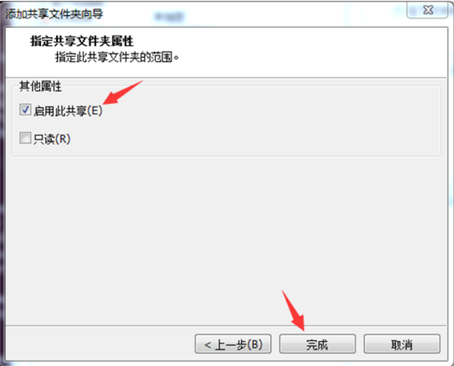 默认勾選“啟用(yòng)此(cǐ)共(gòng)享”,如(rú)果(guǒ)不(bù)想(xiǎng)該文(wén)件(jiàn)夾內(nèi)的(de)內(nèi)容被(bèi)修改,可(kě)以(yǐ)勾選只(zhī)读(dú),此(cǐ)處(chù)我(wǒ)们(men)不(bù)勾選“只(zhī)读(dú)”,點(diǎn)擊“完成(chéng)”按鈕。
