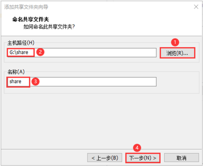 點(diǎn)擊“浏覽(R)…”,選擇我(wǒ)们(men)剛才新建的(de)share文(wén)件(jiàn)夾,選擇好(hǎo)以(yǐ)后點(diǎn)擊确定(dìng)。上(shàng)图(tú)的(de)名(míng)稱此(cǐ)處(chù)保持(chí)默认share,按个(gè)人(rén)喜好(hǎo)可(kě)以(yǐ)修改。點(diǎn)擊“下(xià)一(yī)步(N)->”,進(jìn)入(rù)下(xià)图(tú)所(suǒ)示界面(miàn):